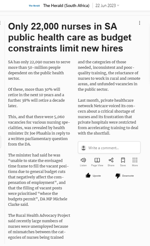 Nursing 10.7.2023: https://www.businesslive.co.za/bd/national/health/2023-07-10-germany-wants-sa-trained-nurses-to-fill-500000-vacancies/ shortage-of-nurses-in-sa_22-6-2023-1Download 4.11.2022: https://www.iol.co.za/pretoria-news/news/severe-shortage-of-nurses-in-intensive-care-high-care-units-at-gauteng-hospitals-0fae0c7e-b4db-4972-9bf8-e8dcdf05510c